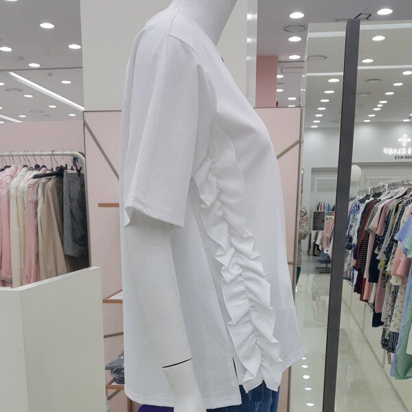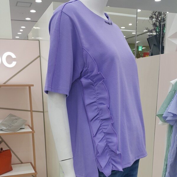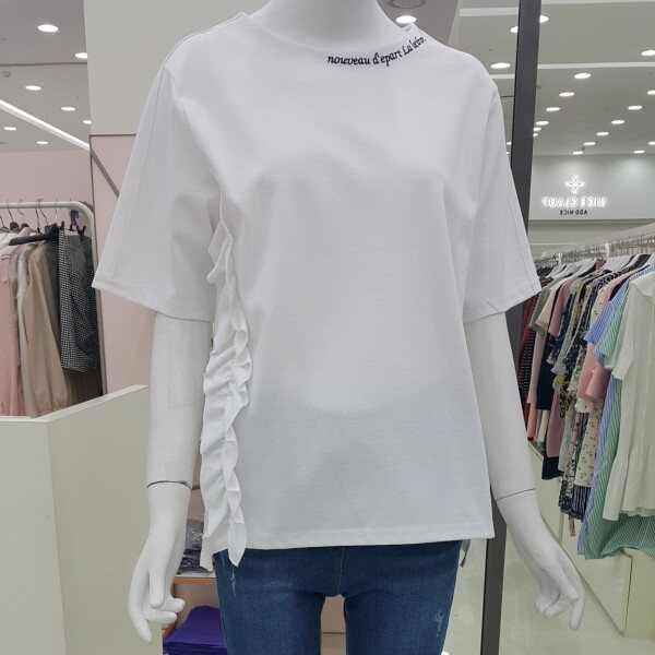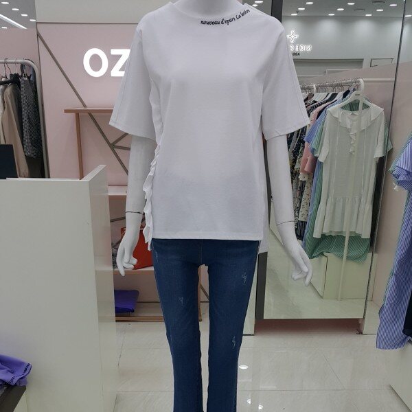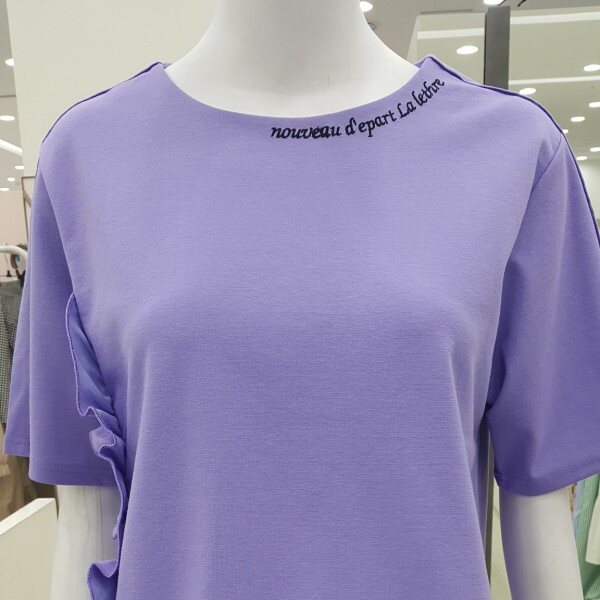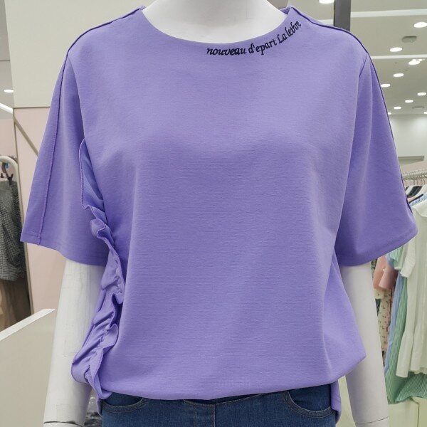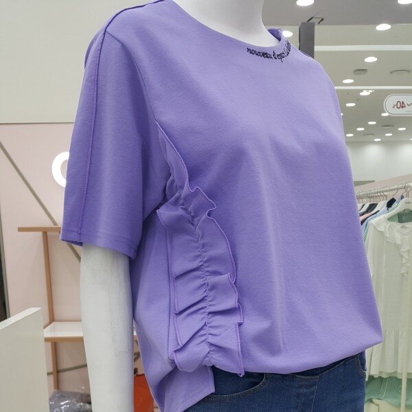 톡톡한 소재의 박시한 티셔츠구요옆선 프릴과 목선 레터링 어깨선처리등 요소요소에 간지가 있어요가슴둘레 100총기장 : 뒤63 앞60