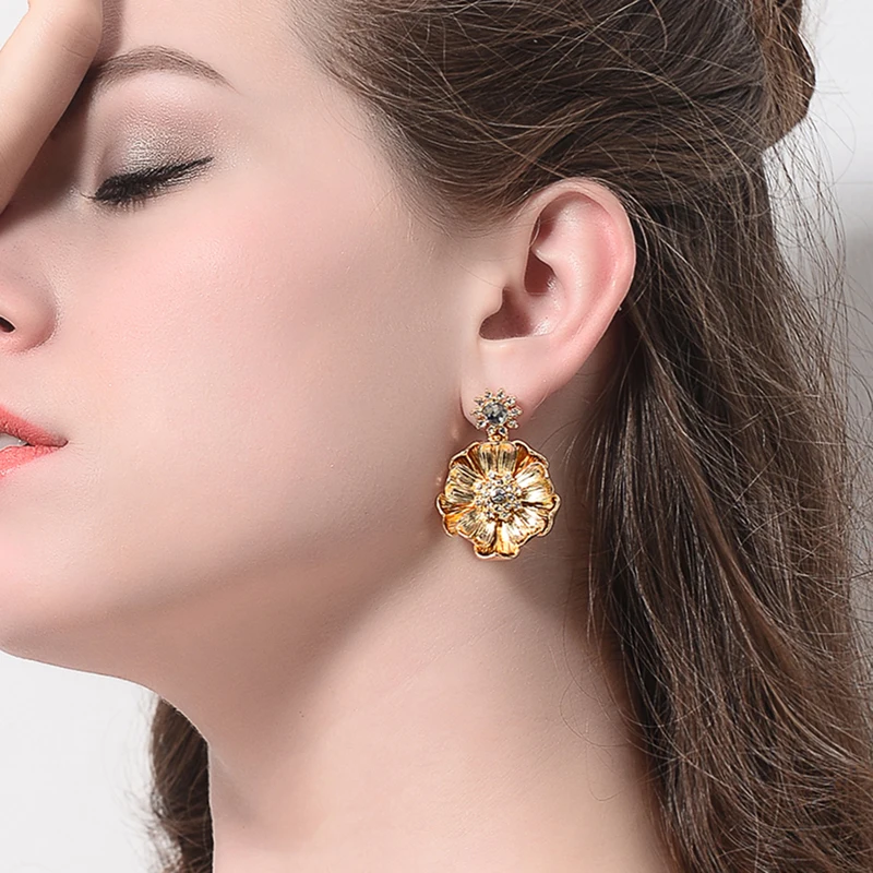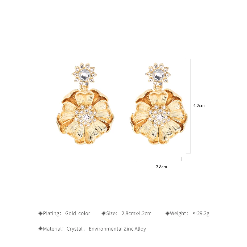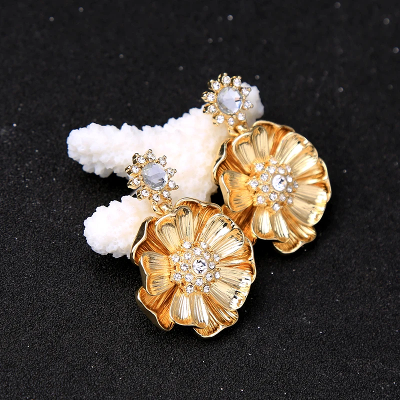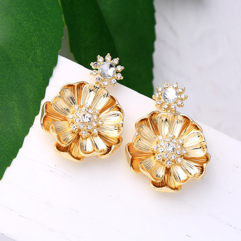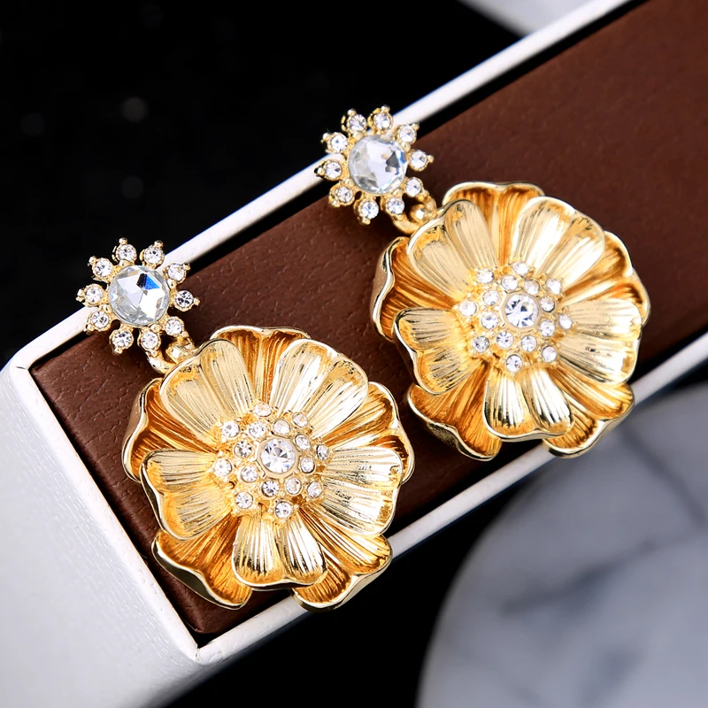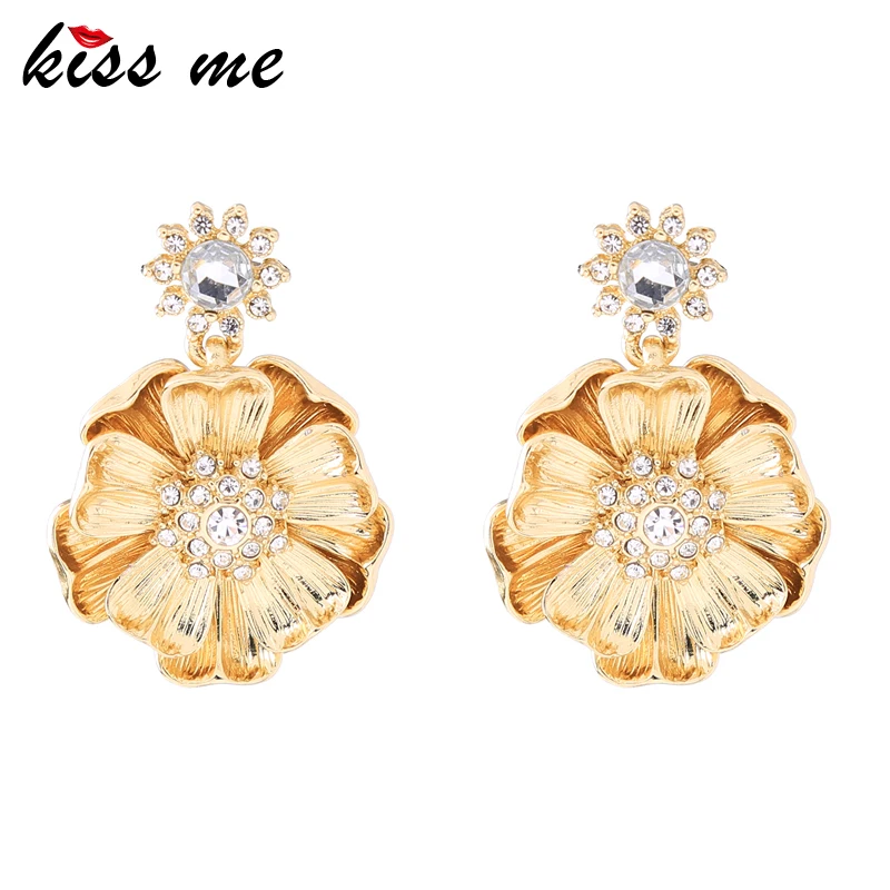 Production name ::KISS ME Gold Color Alloy Crystal Big Flower Earrings