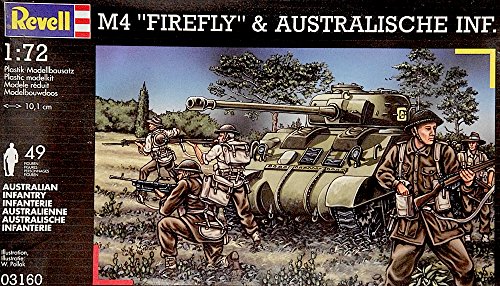 -. Binding : Toy -. Brand : Revell -. EAN : 4009803031606 -. Feature : Revell 03160 WWII M4 "Firefly" Tank & Australian Infantry Plastic Diorama Set in 1/72 Scale / 1/72 Scale / 49 Australian Infantry and M4 "Firefly" Tank Model kit / Plastic Toy Soldier and Tank Diorama with decals and authentic battlefield scenery / New in the box -. IsAdultProduct : 0 -. Label : REVELL -. LegalDisclaimer : WARNING - Contains small parts CHOKING HAZARD. Not for persons under 14 years of age. -. Manufacturer : REVELL -. Model : 03160 -. MPN : 03160 -. PackageQuantity : 1 -. PartNumber : 03160 -. ProductGroup : Toy -. ProductTypeName : TOYS_AND_GAMES -. Publisher : REVELL -. Studio : REVELL -. Title : REVELL 03160 WWII M4 "Firefly" Tank & Australian Infantry Plastic Diorama Set in 1/72 Scale