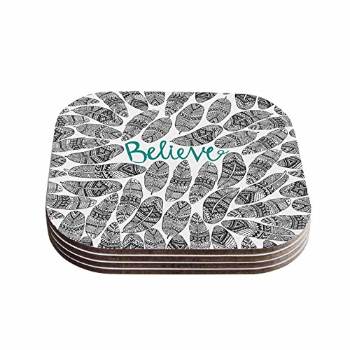 KESS InHouse Pom Graphic Design "Believe" Gray Teal Coasters (Set of 4), 4 x 4", Multicolor