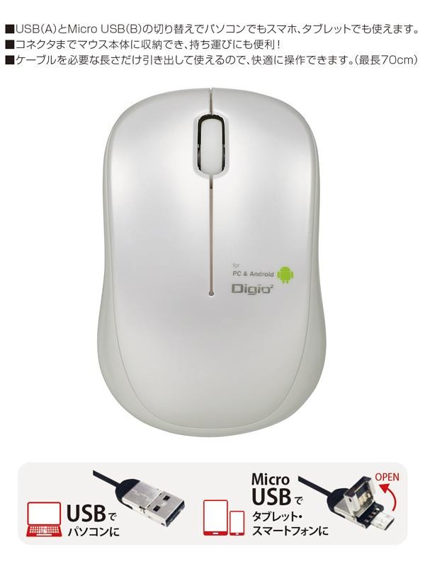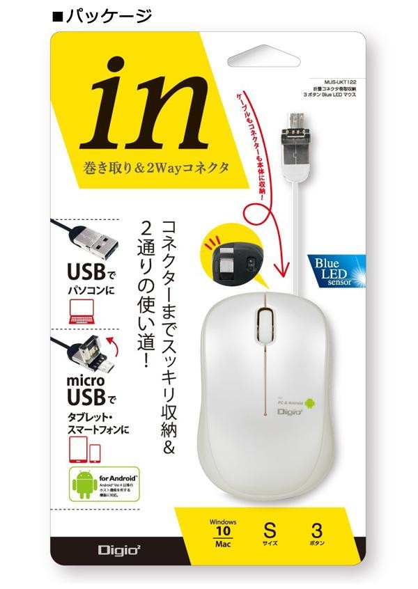 ケーブルもコネクタも本体に巻取収納できるので持ち運びに便利です!!ケーブルを必要な長さだけ引き出して使えるので、快適に操作できます(最長70cm)。USB(A)とMicroUSB(B)の切り替えでパソコンでもスマホ・タブレットでも使えます。 |