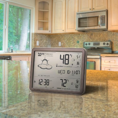 - Feature : Huge display with well-spaced data for very easy, uncluttered reading / Atomic clock updates time for consistent accuracy and no manual setting ever for DST / 14 weather icons show more details regarding the 12- and 24-hour weather forecasts at a glance / Strong signal penetration (enhanced 433 MHz) / Patented Self-Calibrating Forecasting pulls data from a sensor in your backyard to give you the most accurate forecast for your exact location