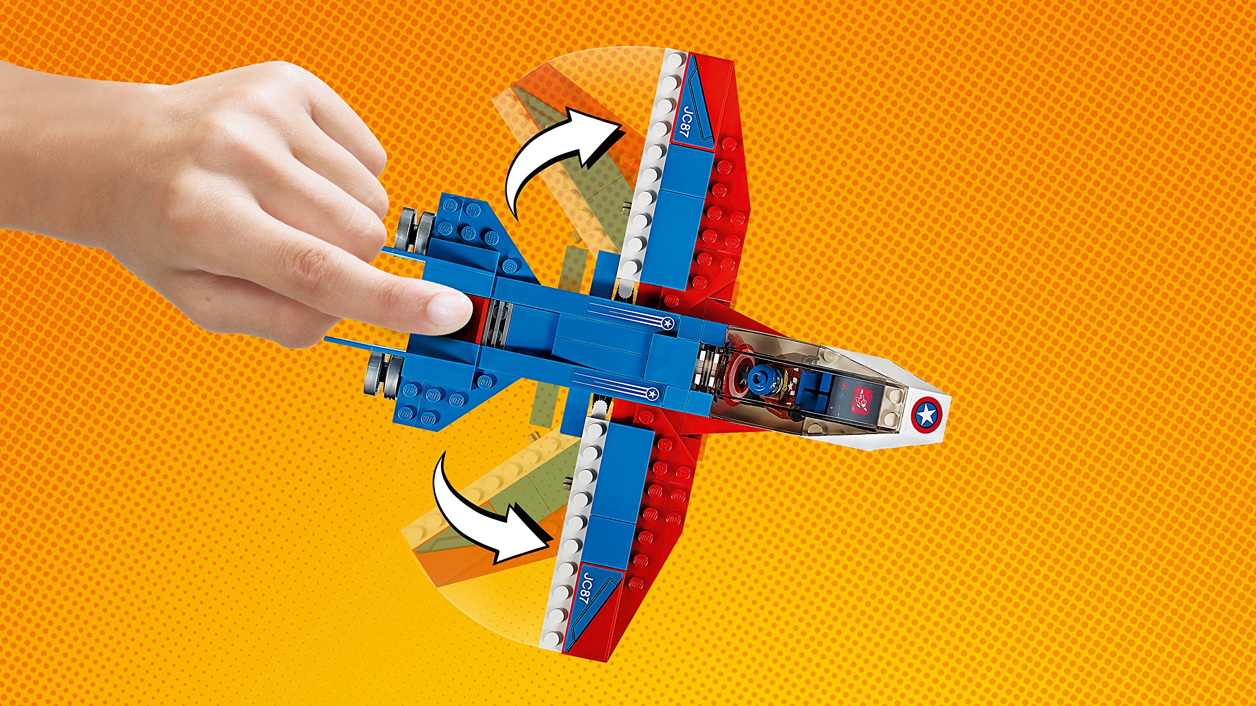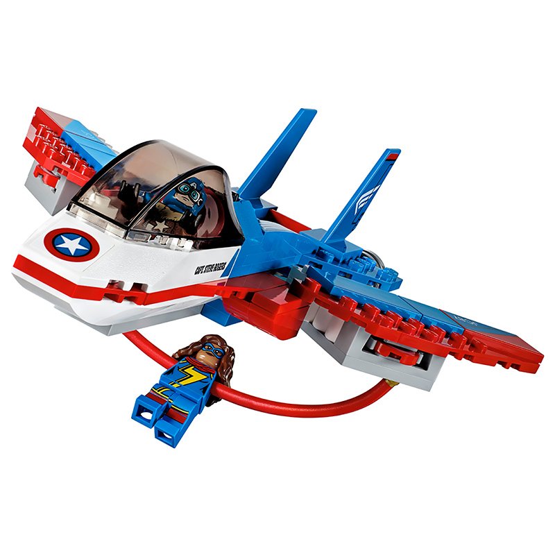 Super Adaptoid strikes Captain America's shield and escapes! Follow the bad guys with Captain America's jet aircraft and regain the shield with Miss Marvel's extended hand.