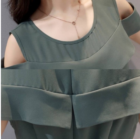 オフショルダー風のトップスは胸元がフリルで可愛い!