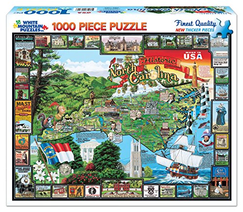 -. Binding : Toy -. Brand : White Mountain Puzzles -. Department : North Carolina -. EAN : 0787799693490 -. Feature : Stretching from the Atlantic Ocean to the Great Smoky Mountains, North Carolina has evolved into the leading industrial state in the South. / South Florida artist Lynn Morgan has loved to draw and paint since childhood, and though she has experimented with various media, pastels are her passion. Her work includes figurative, landscapes, abstracts and glasswork. / Every White Mountain Puzzle is proudly manufactured in America with a 100% customer satisfaction guarantee. / All our puzzles contain unique interlocking pieces that are made of sturdy blue chipboard on recycled paper. / 1000 piece puzzles measure 24"x30" - larger pieces for easy handling -. IsAdultProduct : 0 -. ItemPartNumber : 145PZ -. Label : White Mountain Puzzles, Inc. -. Manufacturer : White Mountain Puzzles, Inc. -. Model : 145 -. MPN : 145PZ -. NumberOfItems : 1 -. PackageQuantity : 1 -. PartNumber : 145PZ -. ProductGroup : Toy -. ProductTypeName : TOYS_AND_GAMES -. Publisher : White Mountain Puzzles, Inc. -. Studio : White Mountain Puzzles, Inc. -. Title : White Mountain Puzzles Historic North Carolina - 1000 Piece Jigsaw Puzzle -. UPC : 724819247516