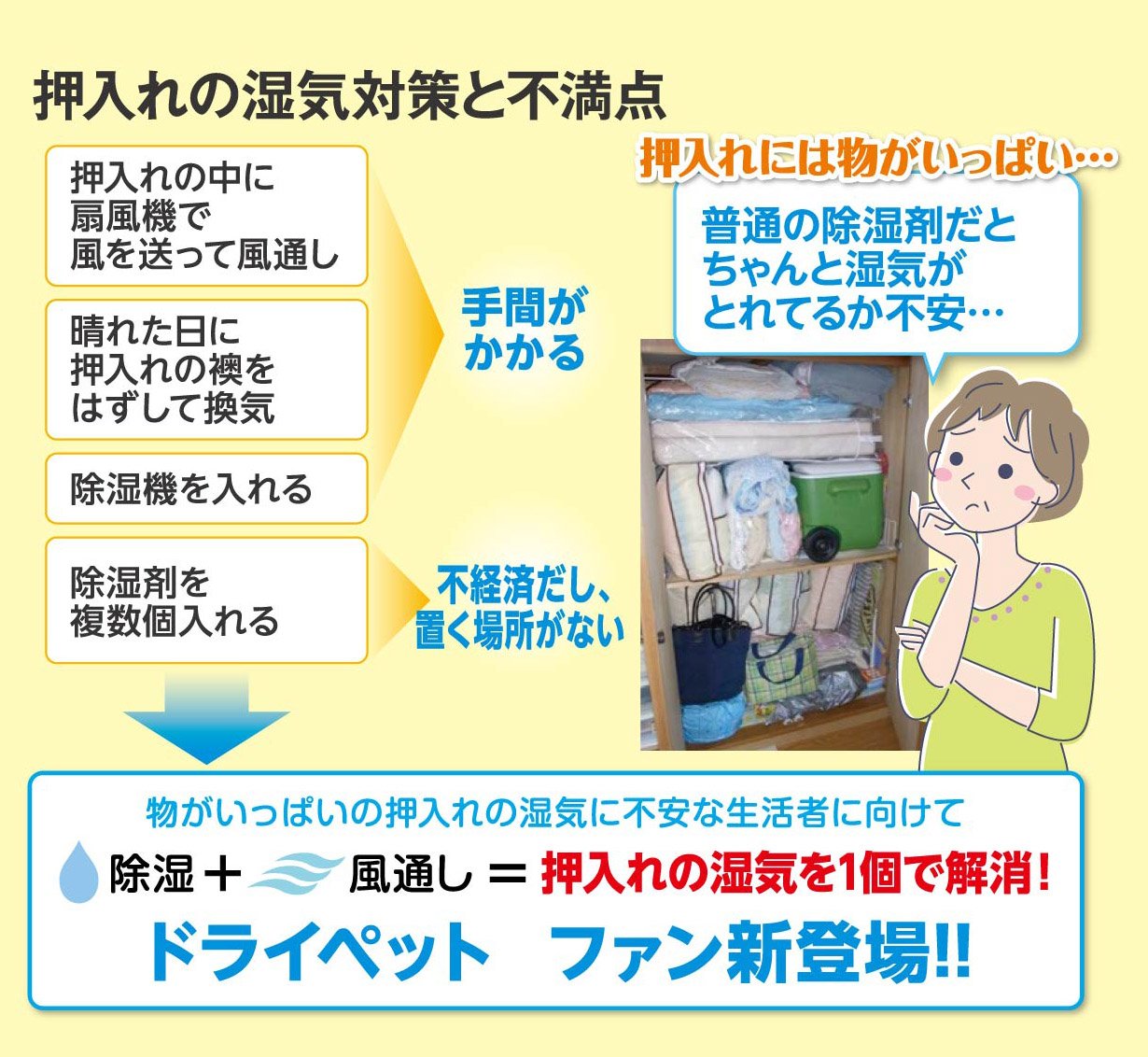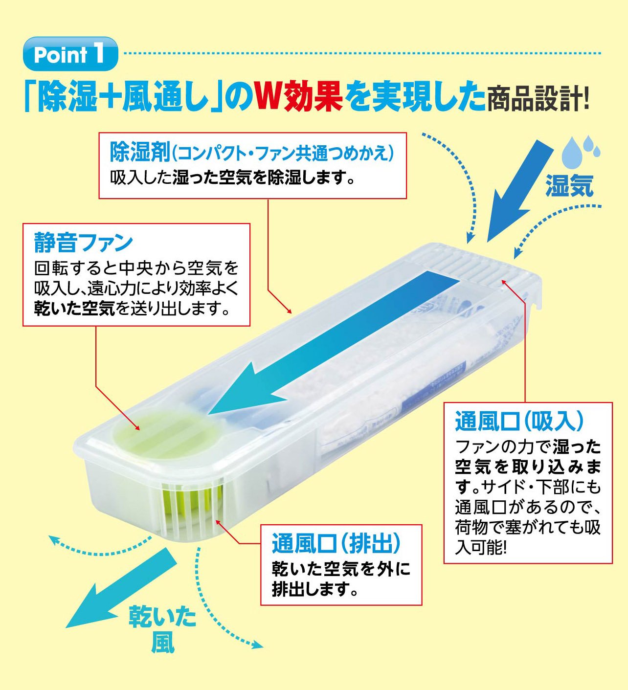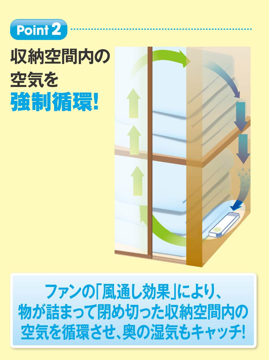 ● Because the wind is sent with a fan, you can not keep the humidity inside the storage space.