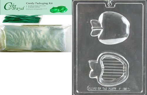 Cybrtrayd Mdk25GR-F122 Apple Pour Box Chocolate Candy Mold with Packaging Bundle, Includes 25 Cello Bags and 25 Green Twist Ties
