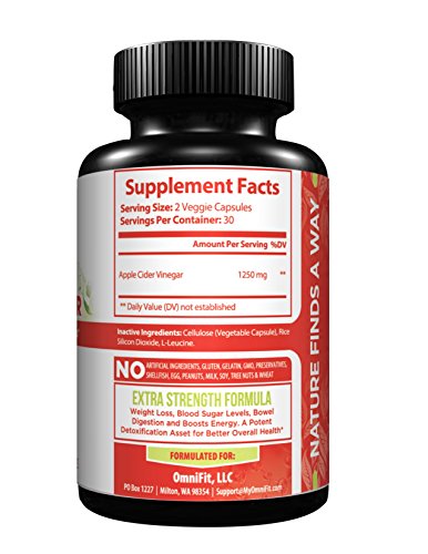 -. Feature : ✔️ PURE - OmniFit Nutrition's NEW UPGRADED Delivery of the Best Selling 100% ALL-Natural Apple Cider Vinegar Proudly Formulated in an FDA Registered, GMP Certified Facility Governed by the State Level Department of Agriculture and Food and in Compliance with the Wholesome Food Act (WFA). DO YOU KNOW WHO'S HANDLING YOUR SUPPLEMENTS? / ✔️ POTENT - 1250mg of Actual Apple Cider Vinegar in an Easy-to-Swallow Veggie Capsule. ABSOLUTELY NO: Antibiotics, Gluten, Hormones, or Sugar. NON-GMO, Vegan Friendly and Vegetarian. FREE OF TOP 10 ALLERGENS: Corn, Artificial Ingredients, Gelatin, Preservatives, Shellfish, Egg, Peanuts, Milk, Soy, Tree Nuts & Wheat. TRUST YOUR GUT! / ✔️ PURPOSE - Among the Many Benefits of Apple Cider Vinegar, None Are More Prominent than its Contributions to Your GUT and WAIST. Well Known as a Potent Detoxification Agent, it also Supports Metabolism, pH Balance, Proper Digestion, Colon Function and Healthy Blood Sugar Levels. Together This Combination Aims at Apple Cider Vinegar as the BEST Source for Weight Management. / ✔️ EMPTY BOTTLE MONEY BACK GUARANTEE-We Are Truly Positive You'll Be More Than Pleasantly SurP.R.Ised with The Results of Our Products, But If for ANY Reason You Are Not, Just Contact OmniFit Nutrition DIRECTLY for a Complete Refund NO Questions Asked!