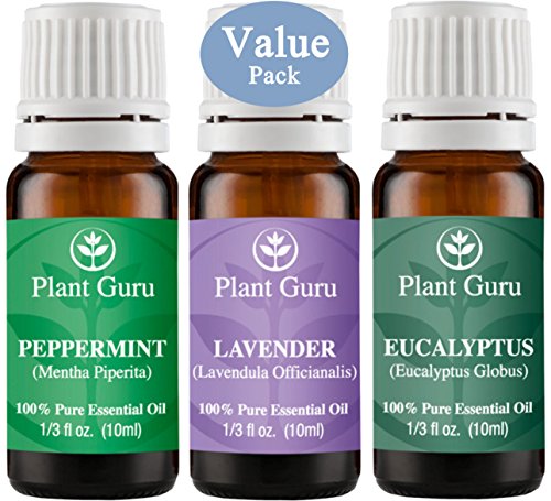 -. Feature : Set Includes 3 - Plant Guru 10ml. Bottles. Lavender, Peppermint & Eucalyptus / HIGHEST SUPERIOR QUALITY ESSENTIAL OILS - STRICT QUALITY CONTROL !!! / ALL OUR ESSENTIAL OILS ARE 100% PURE & NATURAL THERAPEUTIC GRADE. NO ADDED INGREDIENTS / WE NEVER SACRIFICE QUALITY FOR P.R.ICE. "ABSOLUTELY NO" SYNTHETICS, CHEMICALS, CARRIER or BASES ADDED / OVER 140 DIFFERENT 100% PURE NATURAL ESSENTIAL OILS , GIFT SETS AND STATER KIT IN TOP 6, 14, 32, 64