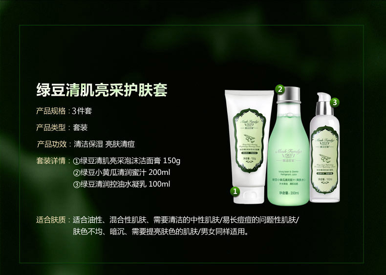 膜法世家绿豆清肌控油3件套 洁面爽肤水洗面奶控油祛痘夏男女套装