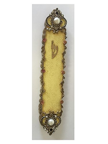 Alef Judaica Beautiful Large Yellow Mezuzah Case - Flower and Leaves Border with Pearls and Crystal On Either End