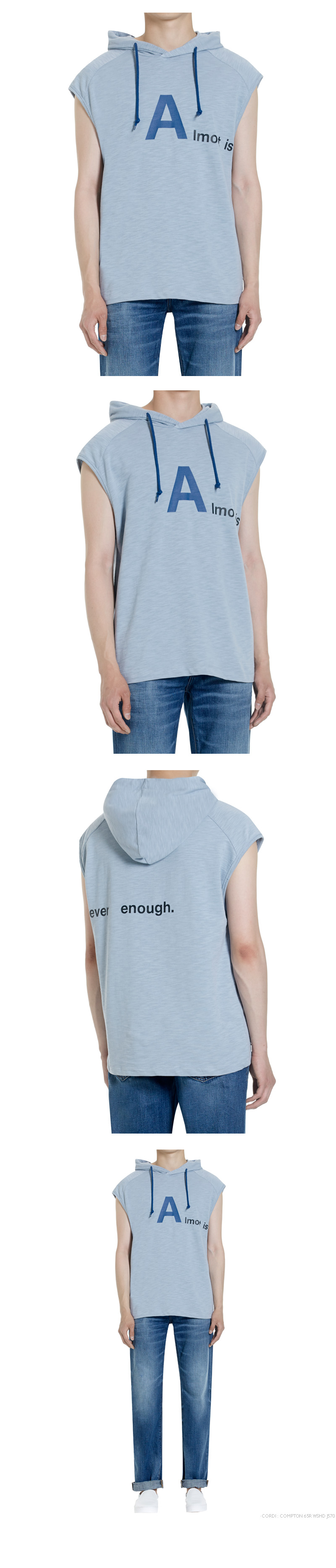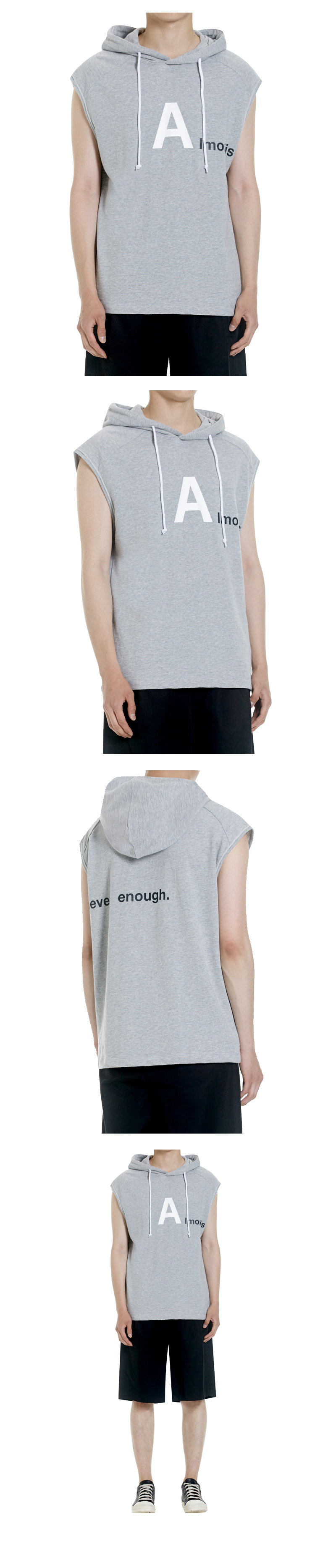 | - 후드가 달린 넉넉한 사이즈의 슬리브리스 - 앞뒤로 이어지는 기본 프린트 - 슬럽원단사용 - COTTON 100% | |