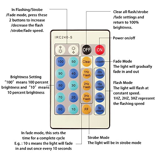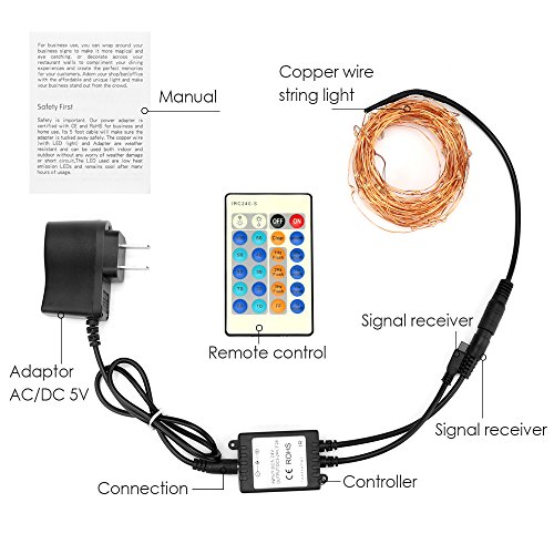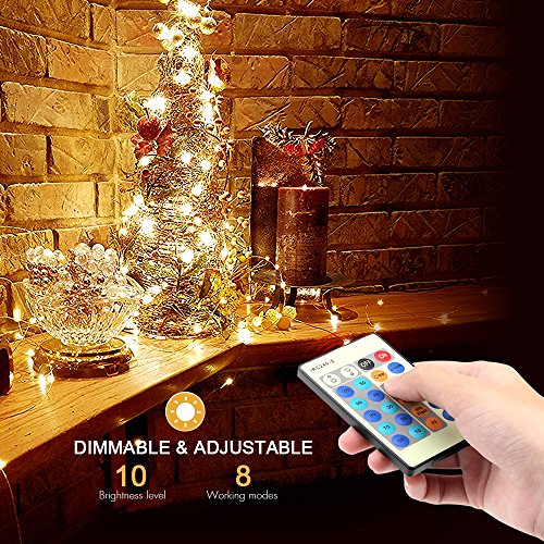 - DIMMABLE LED STRING LIGHTS : 33ft copper wire with 100 warm white Mini-LEDs. With wireless 24 key remote control, remote adjusts 10 brightness levels and 3 different modes - Smooth / Flash / Strobe,create a vibrant scene with a variety of styles.