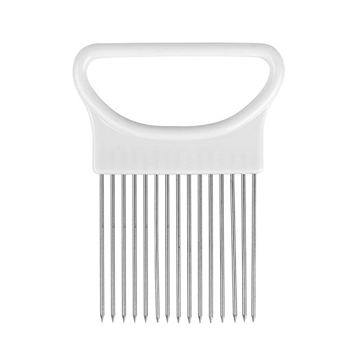 -. Feature : The stainless steel picks will hold your onion in place making it quick and easy to cut the onion. / Onion holder features unique stainless steel prongs that allow you to hold & slice onion hands-free. / Onion slicer guide has large comfortable handle designed to prevent cuts & scrapes. / Holds & slices uniform sections of tomatoes, potatoes, cucumbers, carrots & even hard-boiled eggs! Perfect Kitchen Helper Tool. / Great for right or left-hand users, rust-resistant, hand-wash and dishwasher safe.