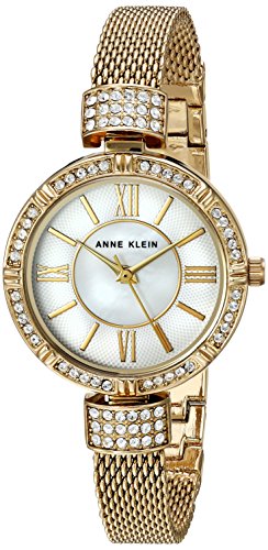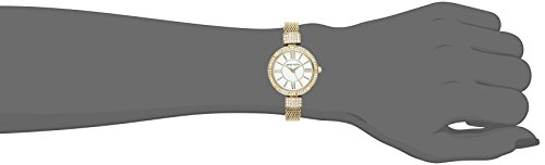 Bezel set with 40 Swarovski crystals; mother-of-pearl dial with gold-tone hands and markers; gold-tone mesh bracelet with 36 Swarovski crystals; adjustable end links; jewelry clasp and extender