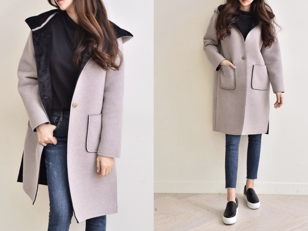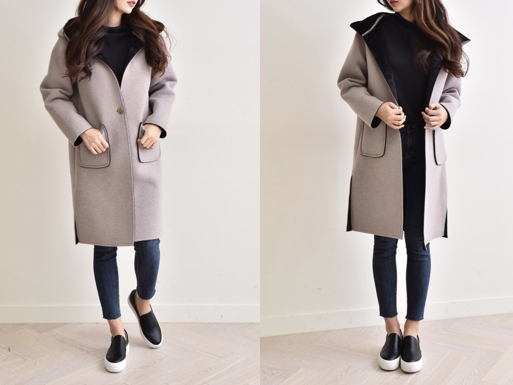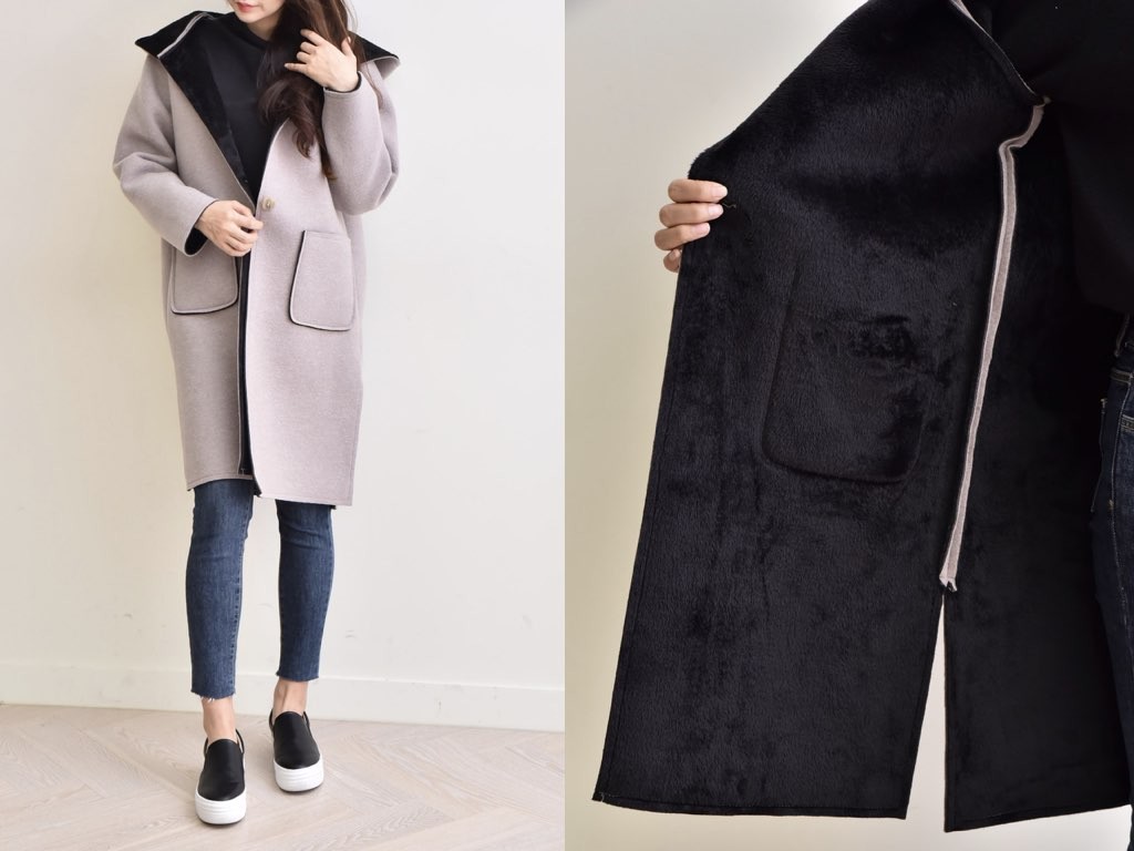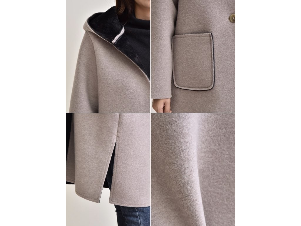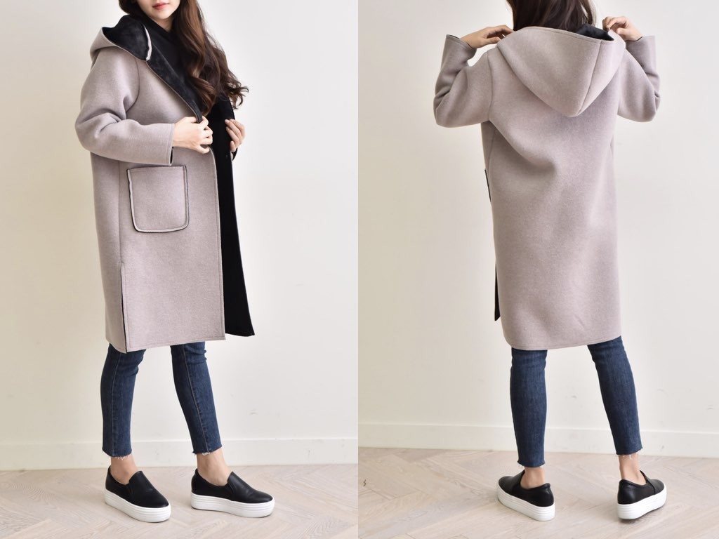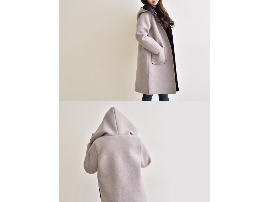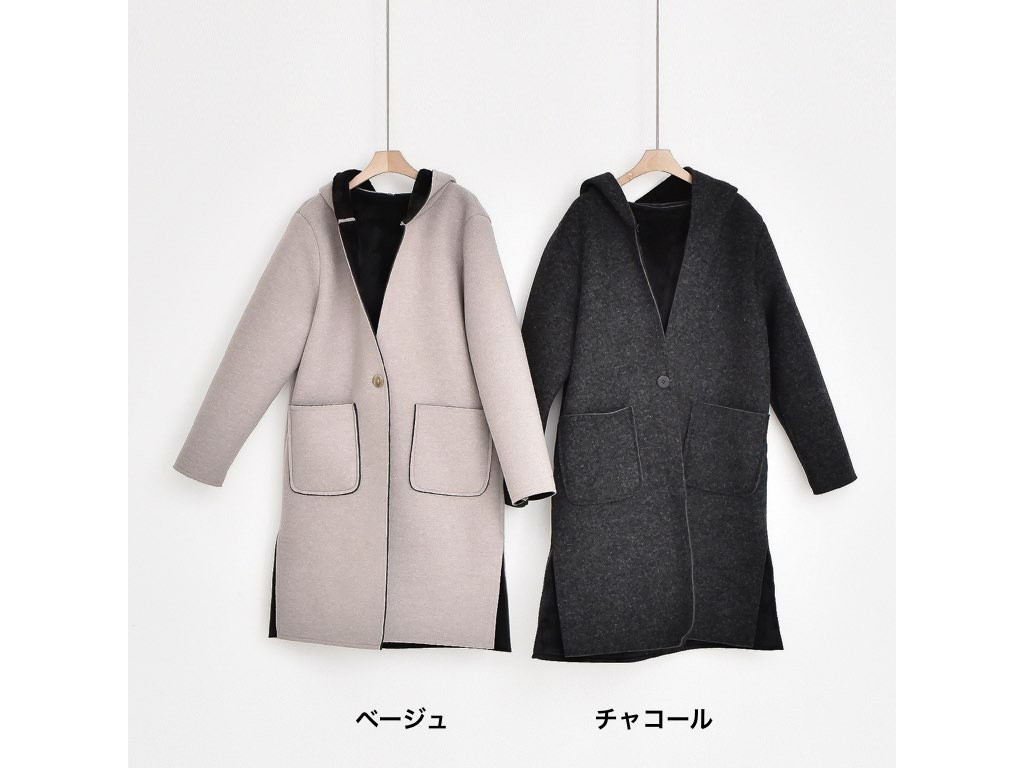 とても上品なフード付きのコートです。2色展開となっており、さらりと着流せる膝丈(着用モデルの身長は、163cm)です。とてもシンプルなデザインなので、トップにニット・タートルネックなどと相性抜群。裏地はモコモコしており軽くて、とても暖かいです。1.基本情報色:2色展開(ベージュ/チャコール)サイズ:Free素材:表地ウール10%、ポリエステル97%、レーヨン3%、(裏地:ポリエステル100%)製造国:China2.サイズ情報肩幅:47cm身幅(胸断面):57cm 腕の長さ:56cm 着丈(前):94cm (サイズは計る方法に応じて±2〜3cmの誤差があります。ご了承お願い致します)モデル着用サイズ:F※着用モデル(163cm、体重47kg、足のサイズ24.5cm)3.その他の情報厚み:中間透け感:なし伸縮性:中間裏地:あり(ミンク)洗濯方法:ドライ(クリーニング)[注意事項]お取り寄せ商品は、海外より仕入れるため納品まで約10日前後いただきます。また店舗でも販売しており、在庫切れになる場合もございます。ご了承お願い致します。