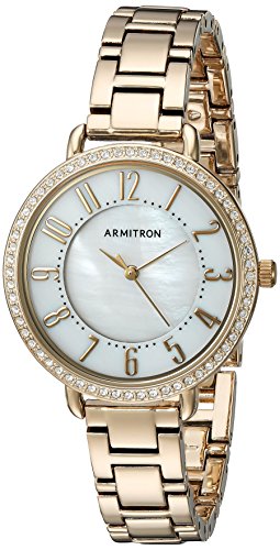 Bezel set with 60 clear Swarovski crystals; mineral crystal lens; mother-of-pearl dial with gold-tone hands and easy to read Arabic numerals; black printed inner minute track
