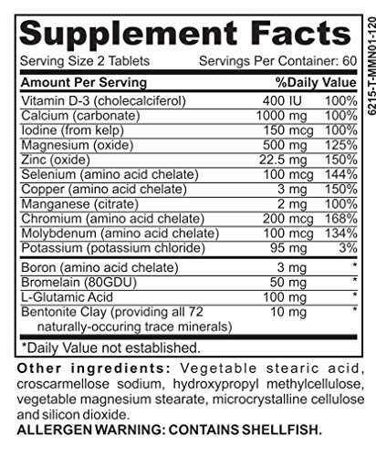 PROFESSIONALLY FORMULATED WITH: Vitamin D-3 (as cholecalciferol), Calcium (as carbonate), Iodine (from kelp), Magnesium (as oxide), Zinc (as oxide), Selenium (as amino acid chelate), Copper (as amino acid chelate), Manganese (as citrate), Chromium (as amino acid chelate), Molybdenum (as amino acid chelate), Potassium (as potassium chloride), Boron (as amino acid chelate), Bromelain (80GDU), L-Glutamic Acid, Bentonite Clay (providing all 72 Naturally-occurring trace minerals)