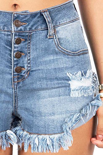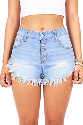 Classic high waisted shorts with distressing details and a heavily frayed hem. Traditional 5-pocket construction and button up fly closure.Feature
