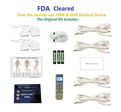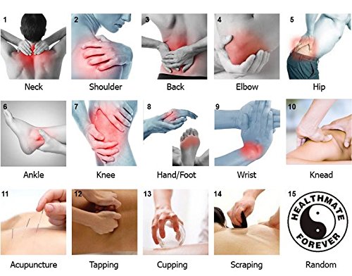 • HOW OUR ELECTROTHERAPY DEVICE WORKS? Using bioelectricity technology, the device sends frequency electrical pulses to your muscles through the conductive electrode pads. Your muscles respond to the impulses by contracting and relaxing rhythmically. The contracting and relaxing of your muscles produces soothing massage sensations that are similar to that given by a massage specialist. The sensation of massage is very real. You will wonder who is administering your massage-but it is just the device! It penetrates muscle group deeper than human hands can. When you place electrode pads in the pain points, you will feel instant relaxation and pain relief. Using modern human body simulation technology to simulate ancient Chinese therapeutic methods and digital programming technology, your control unit has several different massage modes such as: Tuina, Acupuncture, Tapping, Guasha, Bodybuilding, auto mode, etc. • HOW OUR ELECTROTHERAPY DEVICE WORKS FOR PAIN RELIEF? Our pain relief devices use Electrotherapy technology, which is a treatment that uses voltage electrical currents to relieve pain and provides other therapeutic benefits. A gentle electrical current is passed through electrodes which are attached to the skin near the site of the pain or discomfort. The pulses send electrical pulses through the central nervous system, thus blocking pain receptors. Exactly the same way as a strong painkiller would work. • THE KIT INCLUDES: a. 1 HealthmateForever YK15 ElectroTherapy Device (Combined TENS Unit and Muscle Stimulator), b. 8 Pieces of Self-Adhesive Conductive Reusable Gel Pads, c. 4 Sets of Dual Leads Wire (3.5mm Plug), d. 1 Pads holder, e. 3 AAA batteries, f. Operating Manual, g. Acupuncture Placement Point Chart, h. Lifetime Warranty Card, i. BONUS: Free Educational Reference Booklet (25pages)