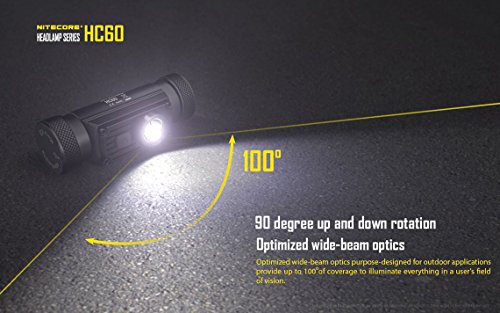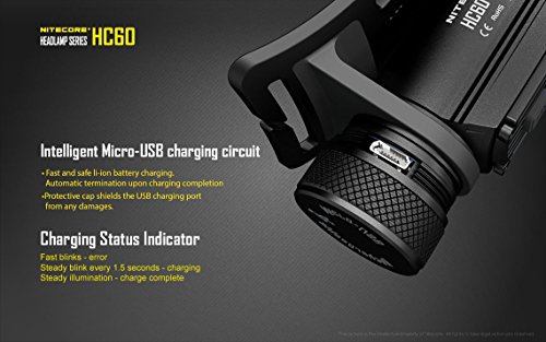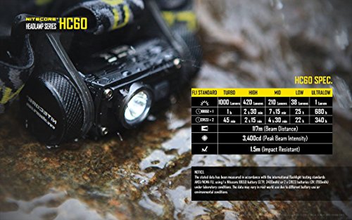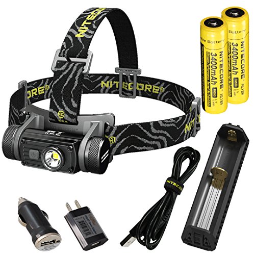 Nitecore HC60 1000 Lumen USB Rechargeable LED Headlamp with 2x Nitecore 3400 mAh 18650 batteries, Nitecore USB Charger and LumenTac Car & AC USB Adapters