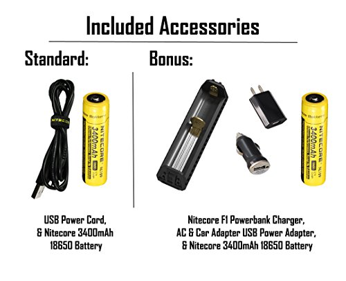 Comes with two Nitecore brand 3400 mAh 18650 batteries for backup battery, a Nitecore USB charger as well as a USB charging cable and bonus LumenTac AC and Car USB adapters for easy charging wherever you go!