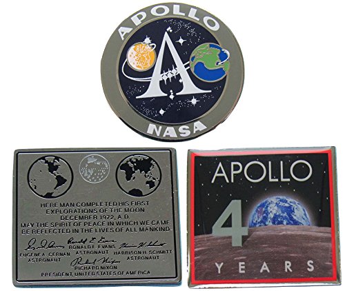 - Includes the Apollo program logo, the 40th anniversary, and a replica of the plaque left on the moon by the Apollo 17 crew