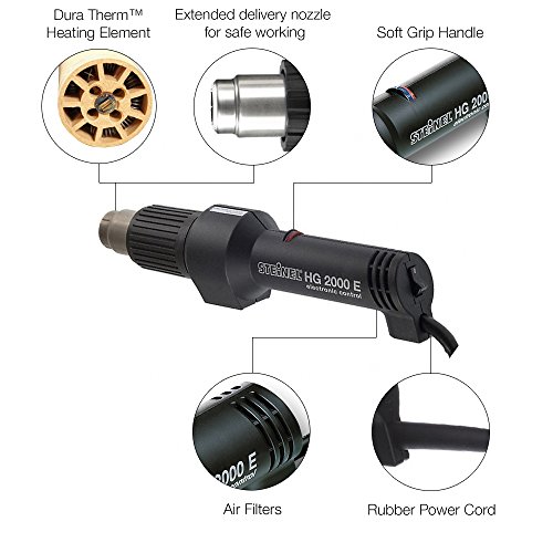 STEINEL HG 2000 E - powerful 1500 W heat gun with variable temperature between 200°F - 1100°F (49°C - 593°C) and electronic thermocouple control for flexible use and maximum reliability, exclusive DuraTherm heating element ensures long life and even heat,