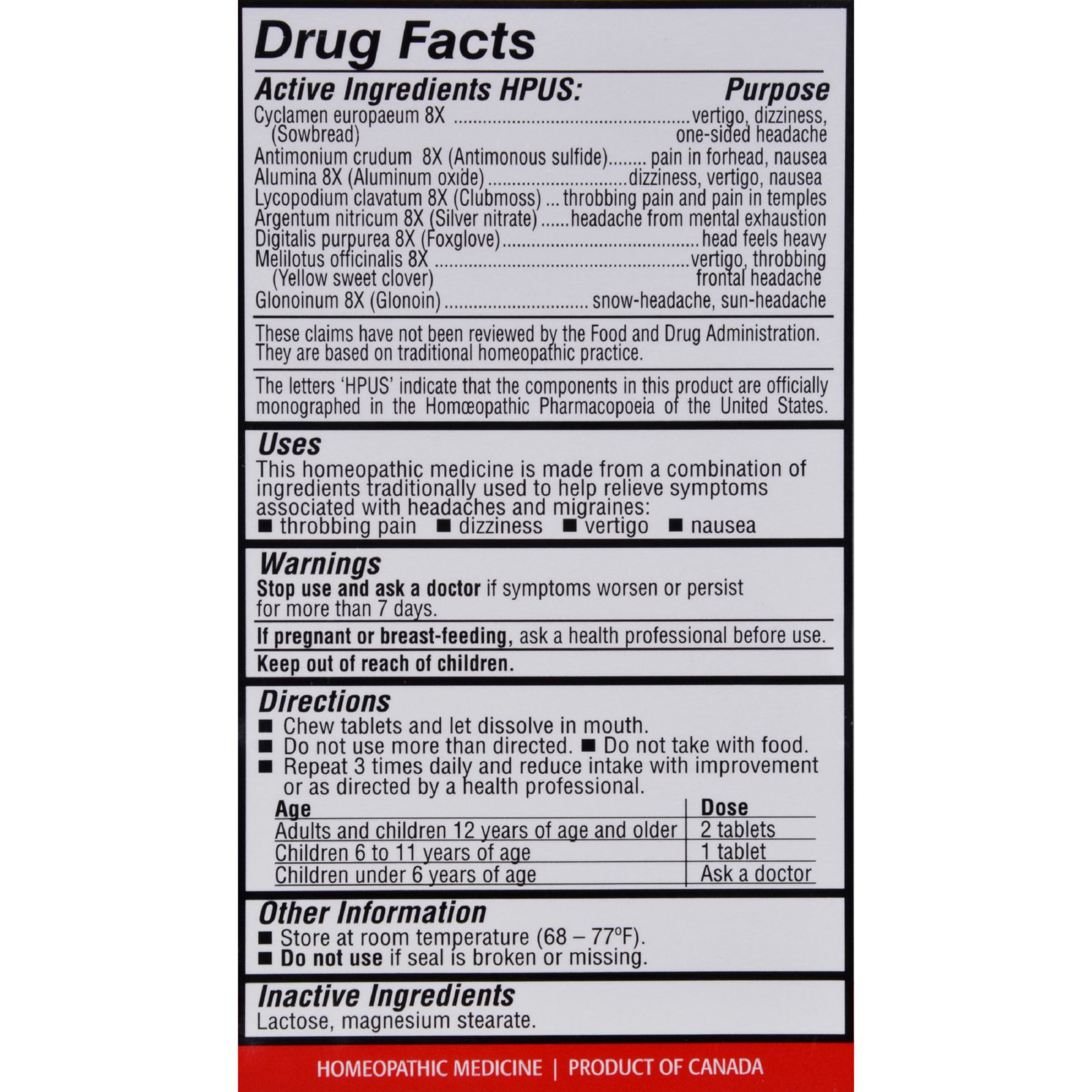 | Helps Relieve: Throbbing Pain Vertigo Nausea Dizziness Naturally Healthy Safe and Effective Homeopathic Medicine This homeopathic medicine is made from a combination of ingredients traditionally used to help relieve symptoms associated with headaches and migraines: throbbing pain; dizziness; vertigo; nausea. Disclaimer: These statements have not been evaluated by the FDA. These products are not intended to diagnose, treat, cure, or prevent any disease. Ingredients : Active Ingredients HPUS: Cyclamen europaeum (sowbread) 8X..........vertigo, dizziness, one-sided headache Antimonium cruden 8X (Antimonous sulfide)..........pain in forhead, nausea Alumina 8X (Aluminum oxide)..........dizziness, vertigo, nausea Lycopodium clacatum 8X (Clubmoss)..........throbbing pain and pain in temples Argentium nitricum 8X (silver nitrate)..........headache from mental exhaustion Digitalis purpurea 8X (Foxglove)..........head feels heavy Melilotus officinalis 8X (Yellow Sweet clover)..........vertigo, throbbing frontal headache Glohoinum 8X (Glonoin)..........snow-headache, sun-headache This product is manufactured according to the Homeopathic Pharmacopoeia of the United States (HPUS). Inactive Ingredients: Lactose, Magnesium Stearate. Size : 90 TAB Pack of : 1 Product Selling Unit : each |