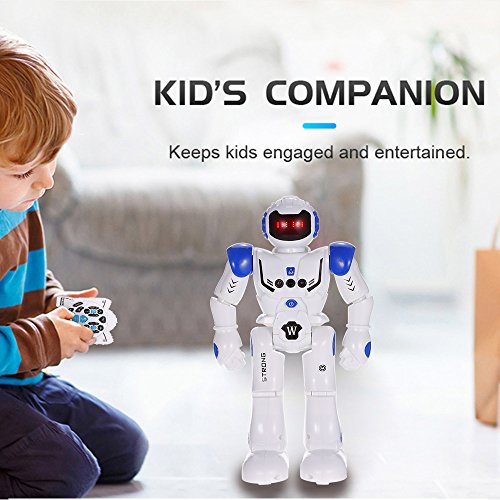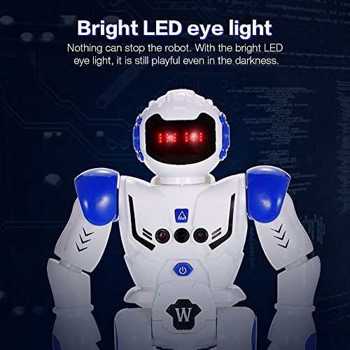 -. Feature : It can slide forward/backward, slide forward/backward, turn left/right. / The robot can sing and dance to entertain you. / The robot can be programmed to carry out movements as you create. / Gesture control: using simple gestures, the robot can react to your gestures with basic movements, along with sound effects. / With the rotating wheel at the bottom, it will avoid obstacle without tripped.