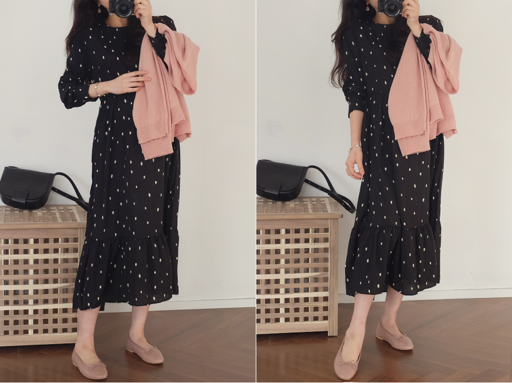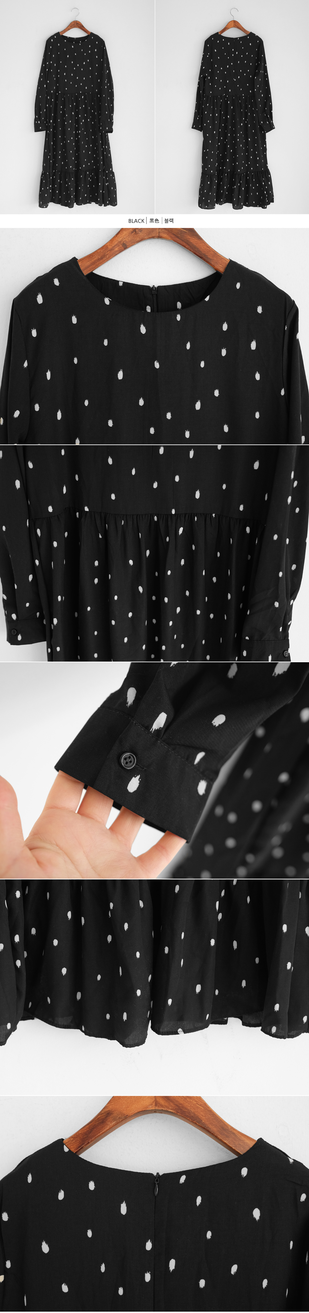흩날리는 꽃잎같은 도트패턴이 포인트인 러블리한 롱 원피스에요.