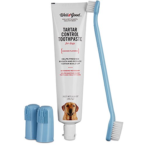 The Well & Good Dental Health Kit for Dogs contains almost everything you need to get your pup's smile shining. This dog toothbrush and toothpaste kit features chicken flavored paste, an angled brush for getting those hard to reach choppers and two finger brushes for more detailed care.Feature