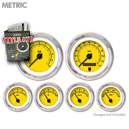 Studio : Aurora Instruments Publisher : Aurora Instruments Binding : Automotive Product Description Style Kit - Metric Rider Yellow, Black Vintage Needles, Chrome Trim Rings Aurora Style Kits lets you transform the look of your Aurora Gauges with ease. Each gauge style kit includes gauge faces, needles, and trim rings for oil pressure, fuel level, tachometer, speedometer, volt, clock, oil temperature, and turbo boost. Simple, detailed instructions make changing out your Aurora gauge faces, needles, and trim rings a snap - even when the gauges are installed. Choose from thousands of gauge face styles or create you own online. Available in Imperial (SAE) and Metric. Aurora gauges offers the worlds largest selection of gauges and instrumentation for your ride, and are the world's only gauges offering interchangeable gauge faces, trim rings, and needles. Choose from thousands of designs and options, or custom create your own . 0