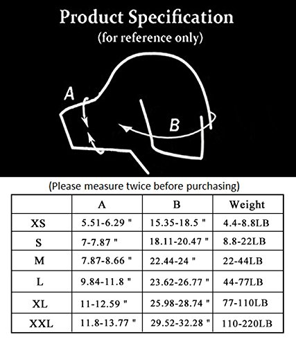 Studio : Avivnor Publisher : Avivnor Binding : Misc. Product Description Soft Comfortable Leather Dog Muzzle, Allows Drinking and Eating Worry about the dogs barking in public? Worry about your dog eating garbage in the street? Worry about your aggressive dog biting pedestrians or children? Then you need our durable leather dog muzzle which can help you solve all these problems! Brand: Avivnor Material: Leather Package: 1XPet Muzzle Color: Black, Brown Size? XS: Suitable for pet 6.6-22 (2-4KG/4.4-8.8LB) S: Suitable for pet 6.6-22 (4-10KG/8.8-22LB) M: Suitable for pet 22-55 (10-20KG/22-44LB) L: Suitable for pet 55-77 (20-35KG/44-77LB) XL:Suitable for pet 77-99 (35-50KG/77-110LB) XXL:Suitable for pet 77-99 (50-100KG/110-220LB) Please measure your dog's snout to choose the correct muzzle size you need refer to our SIZE CHART. To let your dog not pulling it off easily, you better use this muzzle with a collar (package not include the collar) Advice for Care Instructions Do not over tighten Dog training purposes only Short term use only Hand Wash Only, do not put in washing machine or dryer. Discontinue use if there are any signs of suffocation, breathing abnormally, irritation, discomfort About Product Picture: 1. 0-1in. error of measuring is a reasonable range due to different measurment. 2. Please allow little color difference due to different camera or light environment. If you have any question, please contact us!
