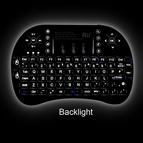Features:92 keys, 2.4GHz wireless Keyboard with Touchpad. Touchpad DPI adjustable functions. Built-in high sensitive smart touchpad with 360-degree flip design. A new broken in classic Rii Mini i8+ new increased LED backlit function, you can us it in black with LED lighting QWERTY keyboard with multimedia control keys and PC gaming control keys. Auto sleep and auto wake mode. The Ergonomically handheld design is easy to carry and operate. Build-in removable rechargeable Li-ion battery that has longer standby time. Specification : Operating range: 15 meters(MAX), without signal disturbance and no direction limit. Frequency range: 2.403GHZ 2.480GHZOperational voltage: 3.3VCharge Voltage: 4.4V 5.25VModulation: GFSK Layout : US Channel: 78 channels TX Power: less than +5dBmTransmission rate: 1M bit/sec Frequency tolerance: +/-30ppmPower consumption: 55mA(on), 1mA(sleep)Battery Type: Built-in lithium-ion battery Notice : After 3 minutes without any operating will into sleep mode, press any key about 1s to wake up. Package Including:1 Wireless keyboard1 Wireless receiver1 Charging data cable1 User manual Note: If your device without USB 2.0 jack, you need buy one.