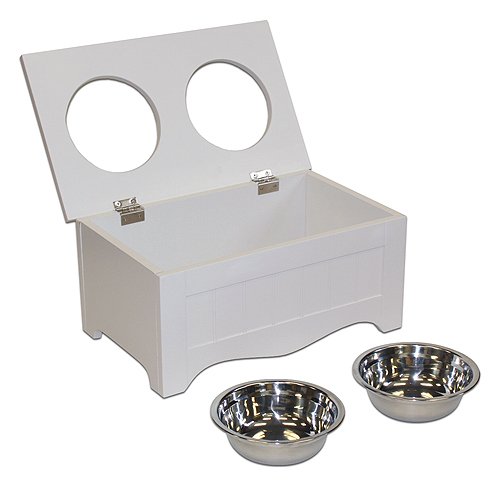 Studio : A Pet Project Publisher : A Pet Project Binding : Misc. Product Description This handsome serving box keeps your pet's food and water at a comfortable height to prevent neck strain and promote healthier digestion. Lift the metal hinged top to store food, toys and other supplies. The APetProject Pet Food Server Storage Box is made from durable MDF with a non-toxic finish and features 2 removable stainless steel bowls. *Some assembly required. 0
