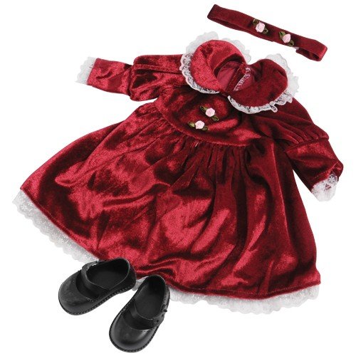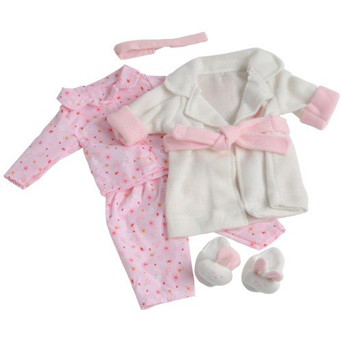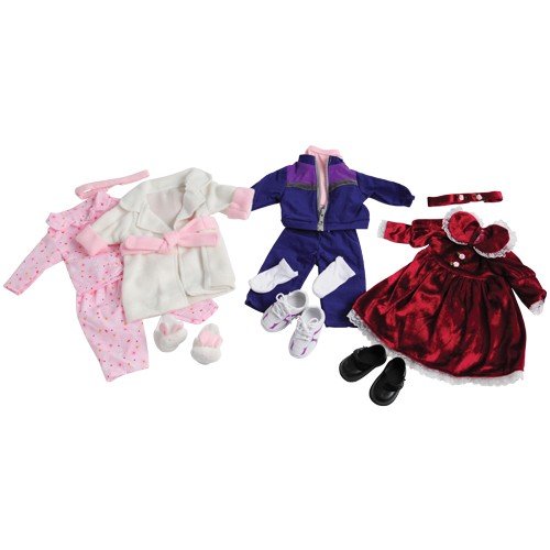 - Includes a pajama top and bottom, robe with sash, pair of bunny slippers and headband, a purple jogging suit jacket and pants, a pink t-shirt, a pair of tennis shoes and socks, a classically designed burgundy dress with matching headband and a pair of black shoes.