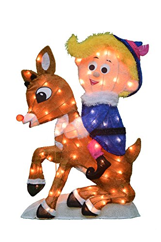 Proudly show off your Christmas spirit with the ProductWorks 32-Inch Pre-Lit Rudolph the Red-Nosed Reindeer and Santa Claus Christmas Yard Decoration. This yard statue features Rudolph and Santa Claus standing next to each other. Pre-lit from within, the statue has 70 clear mini LED lights that illuminate it with a holiday cheer. The sturdy heavy-duty metal frame is sure to withstand the outdoor climate. Great for indoor and outdoor use, the Rudolph and Santa Christmas Yard Decoration comes with ground stakes and spare bulbs to secure the statue and ensure it's always shining a little light in the neighborhood. Measures 32" L x 30" W x 12" H.Feature