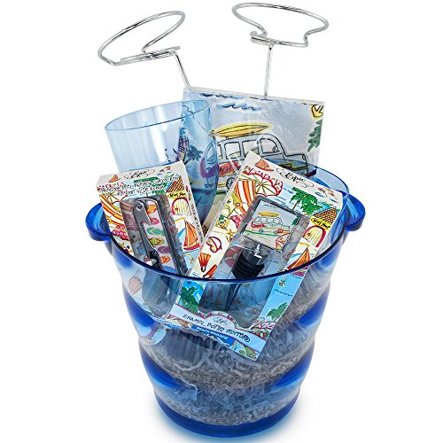 Epic products' beach Bummin' bucket gift set is the perfect outdoor wine gift for picnicking in the park or at the beach. The beach Bummin' bucket gift set contains the following items: one (1) wine shack enamel bottle stopper, one (1) wine shack enamel corkscrew, one (1) package of woody beverage napkins, two (2) wine glass outdoor holders, and two (2) blue acrylic wine glasses. All items are contained inside of the blue swirl acrylic ice bucket, wrapped in clear cello, and topped with a blue ribbon. Epic products Inc. Has been offering high quality wine, spirits, and party accessories & gifts for over 30 years.