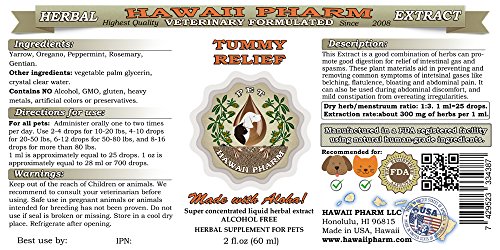 This Tummy Relief Veterinary Natural Alcohol-FREE Liquid Extract made from Dried Yarrow, Oregano, Peppermint, Rosemary and Gentian. The formulation is a good combination of herbs can promote good digestion for relief of intestinal gas and spasms. These plant materials aid in preventing and removing common symptoms of intetsinal gases like belching, flatulence, bloating and abdominal pain. It can also be used during abdominal discomfort, and mild constipation from overeating irregularities or food allergies. Any statements on this page have not been evaluated by the Food and Drug Administration. This product is Herbal Supplement and is not intended to diagnose, treat, cure or prevent any disease. We recommend that you consult with a qualified veterinarian before using this or any other herbal products.Feature