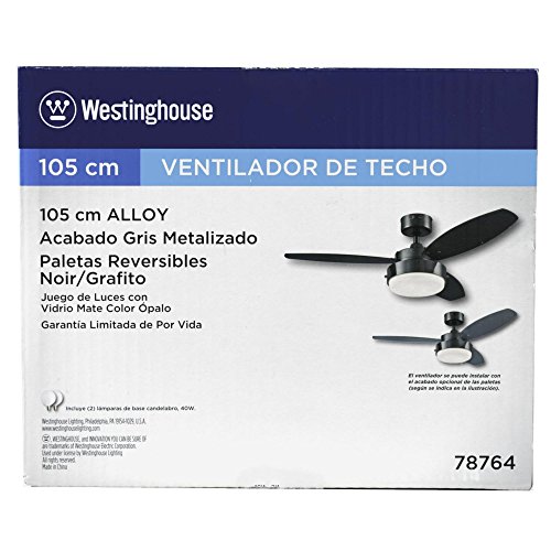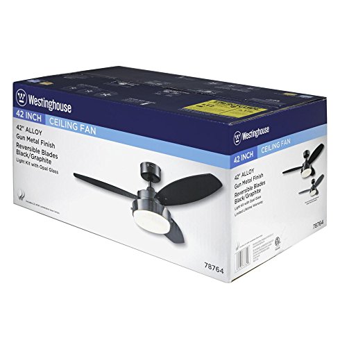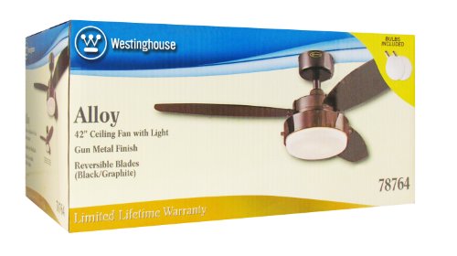 The Westinghouse Alloy Indoor Ceiling Fan features a luminous gun metal finish and black/graphite reversible blades that add a hint of glamour to its modern design. The opal frosted glass light kit blends seamlessly with the design and will bring bright illumination to your home. Three fan speeds (high/medium/low) and a reversible switch help you stay cool in the summer and warm in the winter. Add the striking Alloy to any room in your home and enjoy year-round comfort and elegance. This Westinghouse ceiling fan is backed by a lifetime motor warranty and a two-year warranty on all other parts. Product reference number 78764.Feature