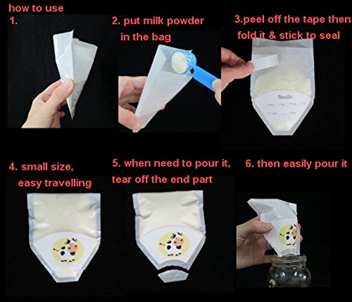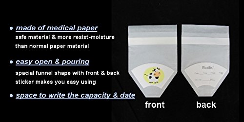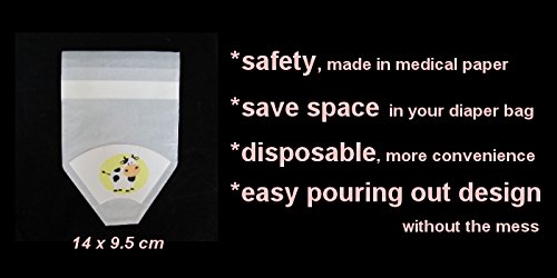 -. Feature : BPA free, made in medical paper / One pouch solve mommy's problem, easy for going out, also great for trip / Small, save space in your diaper bag / Disposable, save your time / Easy pouring out desing, without the mess