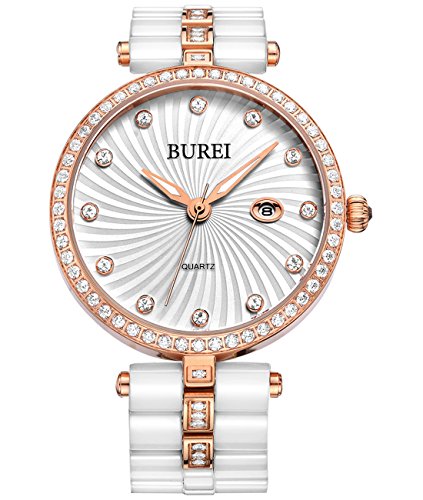 -. Feature : Classic Swiss-inspired women's watch design, with ultra-precise Japanese quartz movement; sleek and professional style is replete with feminine sophistication. / QUALITY - Ceramic band, hypoallergenic; mineral lens; stainless steel case, corrosion- and scratch-resistant; water-resistant to 30m (99ft). / GUARANTEE - 30 days money back guarantee for any reason, 12 mo. replacement or full refund for quality issues, and 24 mo. maintenance for quality issues. / ABOUT BUREI - We design watches and sell them direct from our factory to you, without the heavy P.R.Ice tag, beating competitor's P.R.Ices daily. / Case Diameter: 34mm, Weight: 81g, Band Length: 168 mm, Band Width: 16 mm; Package includes Watch Box, Gift Bag, User Manual, 2-year Warranty Card and Watchband Link Remover Tool; additional colors and styles available from BUREI.