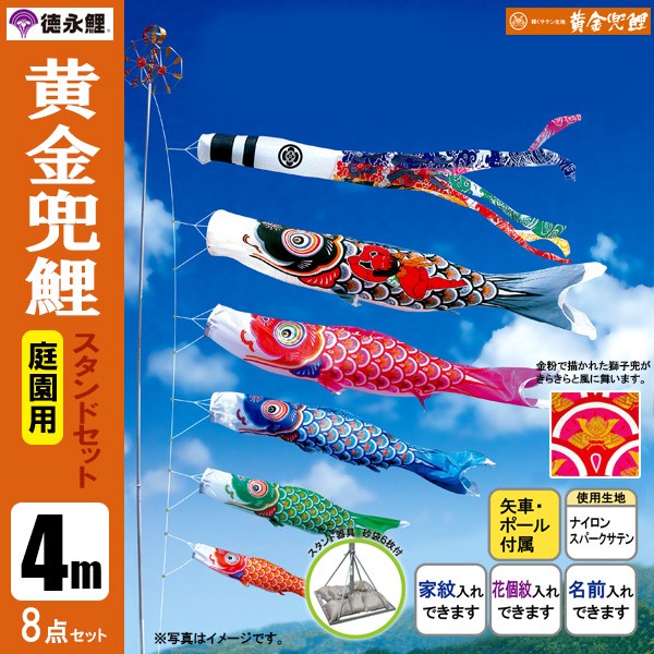 | 黄金兜鯉 庭園用大型鯉のぼり スタンド砂袋式ポール付セット | 1.5m鯉3匹 | 2m鯉3匹 | 3m鯉3匹 3m鯉4匹 3m鯉5匹 | 4m鯉3匹 4m鯉4匹 4m鯉5匹 |