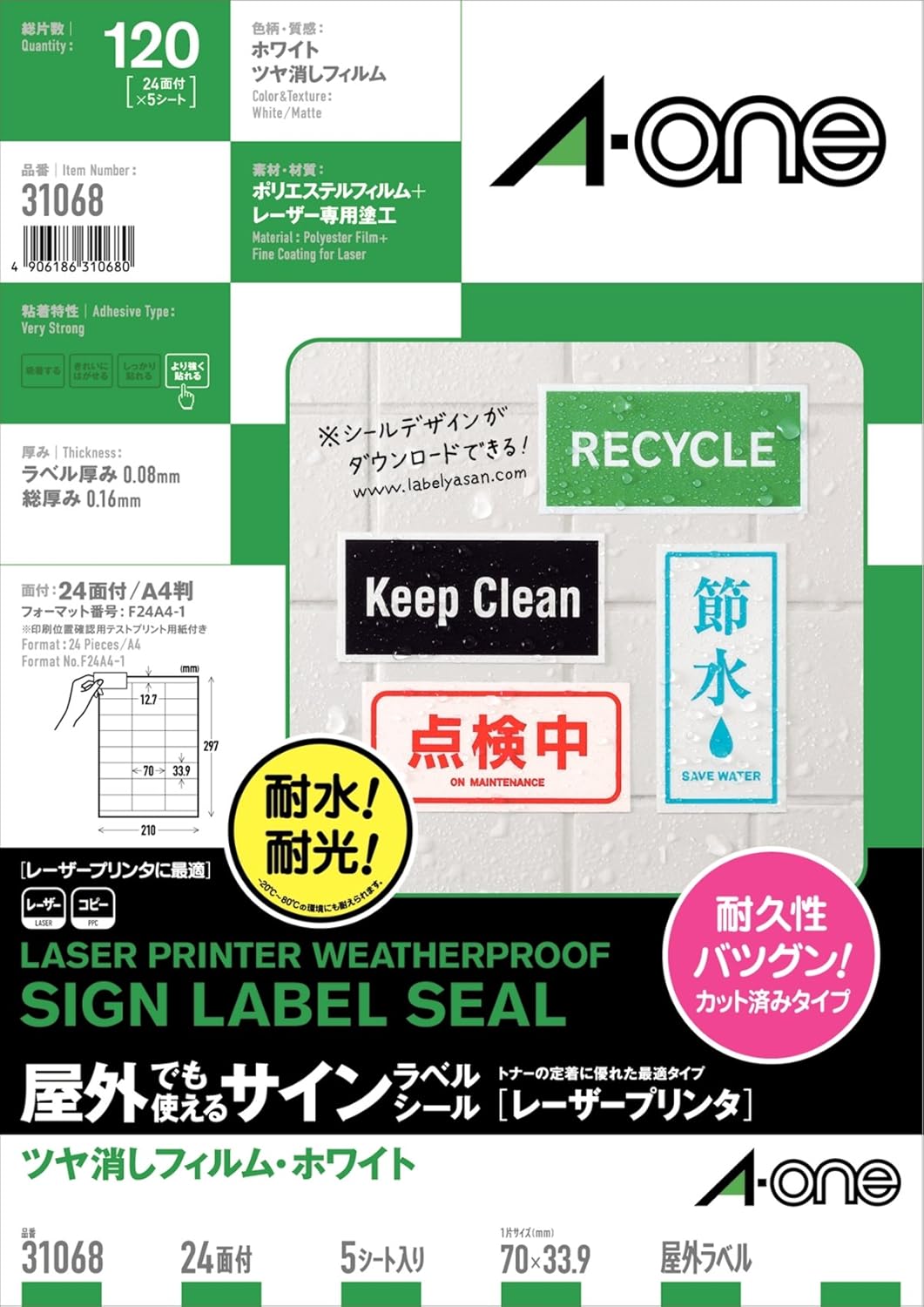 ツヤ消しフィルム・ホワイト/材質:ポリエステルフィルム/標準総厚み:0,16mm/ラベル厚み:0.084mm A4判 24面/シートサイズ:A4判 (210mm×297mm)/ラベルサイズ:70mm×33.9mm(3列×8段) 対応プリンタ: レーザー コピー