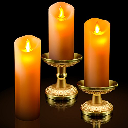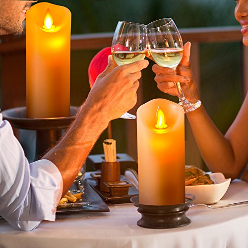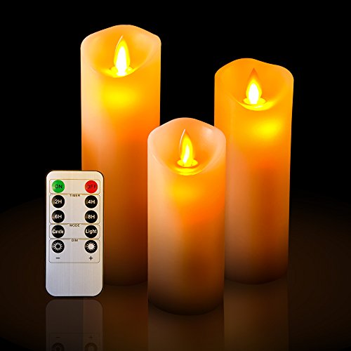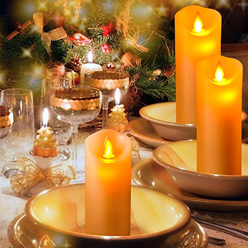 ☺What You Get: a 5" pillar, a 6" pillar, and a 7" pillar (each 2.2" diameter) dancing flame real wax led candles; remote control with 10 different keys x1; User Manual x1.
