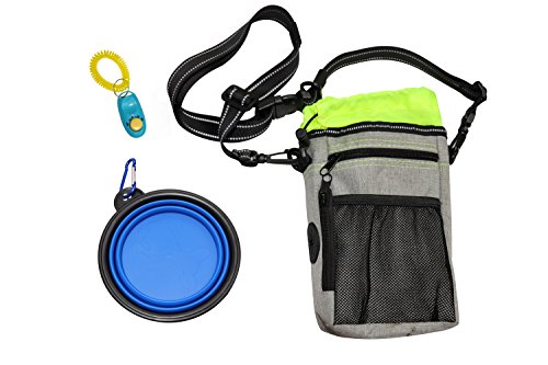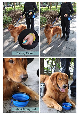 4.Bonus ★ Comes with collapsible dog bowl and training clicker. Collapsible dog bowl holds up to 16 fluid ounces of water or 2 cups of dog food. Training clicker can train the dog basic obedience and correct the bad behavior and easily be carried with the flexible wristband. 0