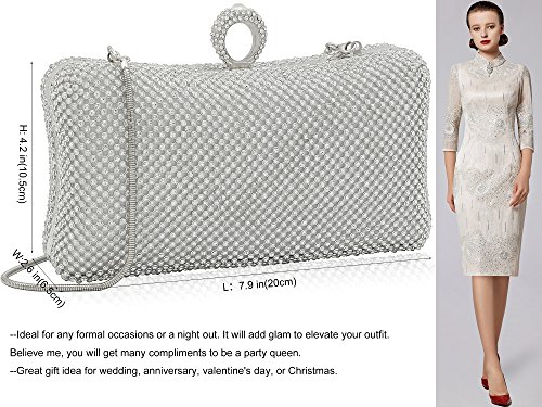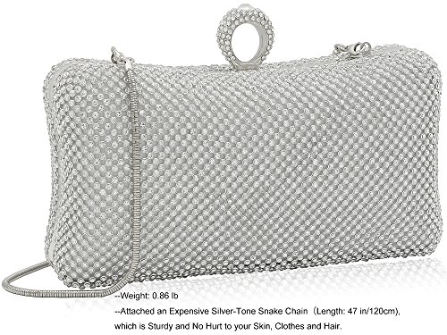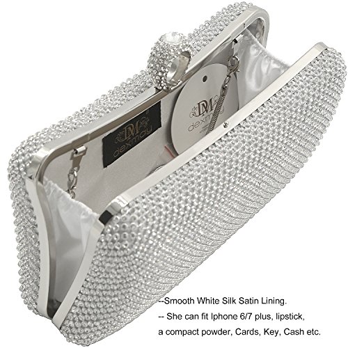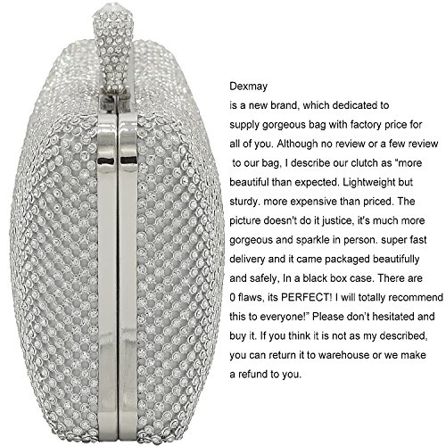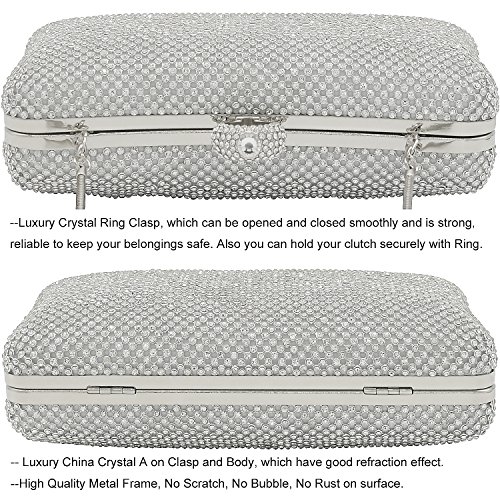 ☻ Material--This evening bag is made of clear rhinestone A, which is very sparkly like a diamond, no blemishes. Silver metal frame, which is no scratch, no bubble, no rust on surface. Smooth Silk Satin Lining.