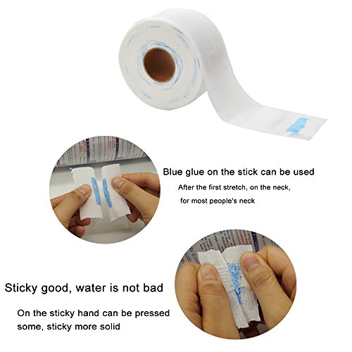 Adjustable and Sticking :Self sticking at any length that you tear off,Just tear off a length at any random point on the roll to fit your neck. Good stretch can wrap on neck and it sticks automatically via the blue sticky tabs every few inches.Suitable for shatterproof hair, avoid from hair dust and dirty.
