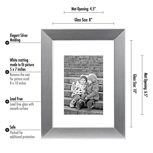 8x10 Silver Picture Frame - Made to Display Pictures 5x7 with Mat or 8x10 Without Mat - Real Glass - Standing Hardware Included